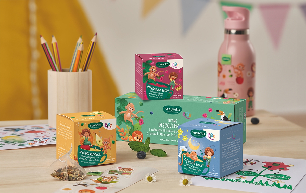 La linea Neavita Kids nasce proprio per accompagnare i più piccoli in un mondo di idratazione gustoso e naturale, con quattro tisane realizzate appositamente per loro (dai 3 anni in su): Allegro Risveglio, Pausa Avventura, Merenda nel Bosco e Acchiappa Luna.